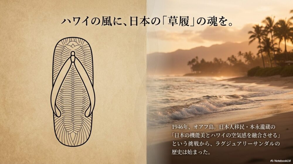 1946年、彼がサンダル工場の原型をオアフ島に作ったのがその始まりでした。驚くべきことに、そのデザインの源は、日本の伝統的な履物である草履や雪駄だったのです。