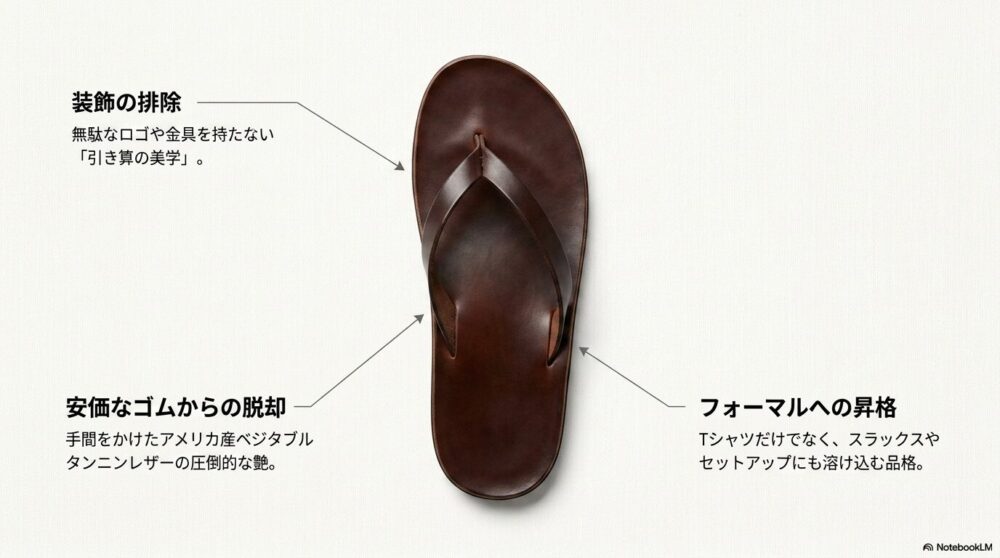 彼らはサンダルを、足元を飾るラグジュアリーアイテムとして定義したのです。そのデザインの根幹にあるのは、日本の草履・雪駄にも通じる引き算の美学。過度な装飾を一切排し、素材の上質さとフォルムの美しさで勝負しています。