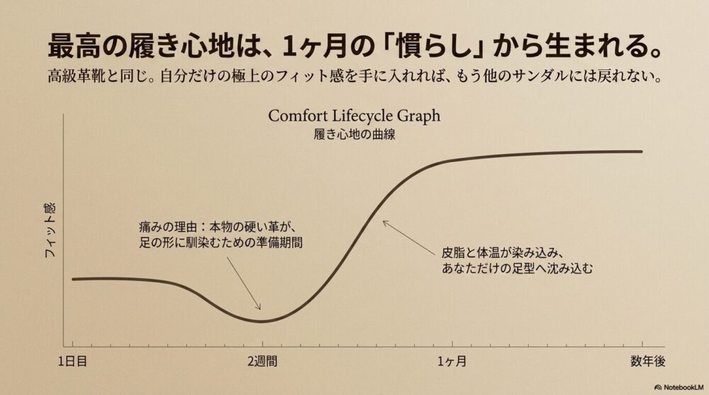 そして履き始めから約1ヶ月ほどで、硬く感じたサンダルが、まるで自分の足の一部になったかのような、吸い付くようなフィット感に変わっていくはずです。