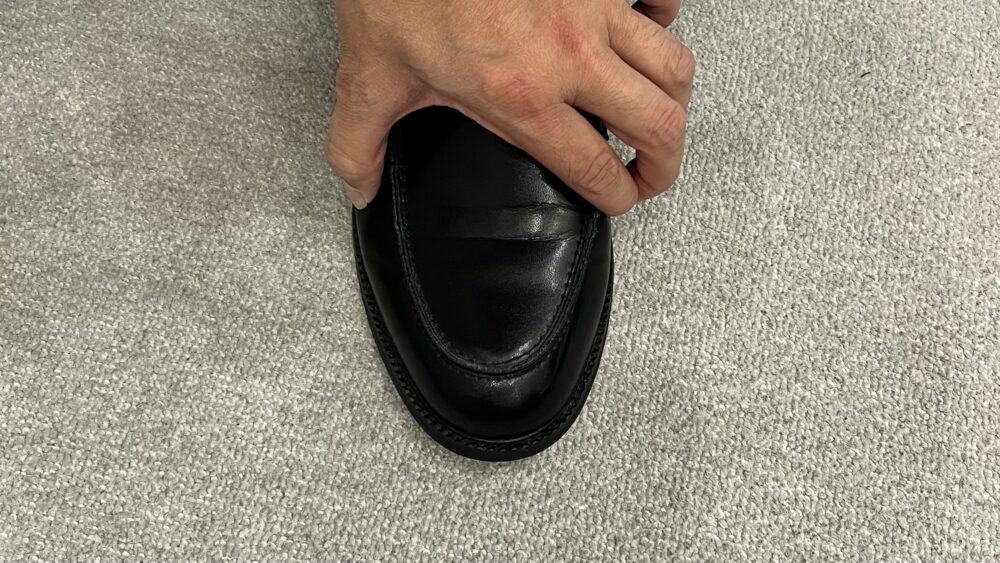 シューホーンなしで履いてしまうと、踵がつぶれてしまったり、型くずれの原因になったりします。