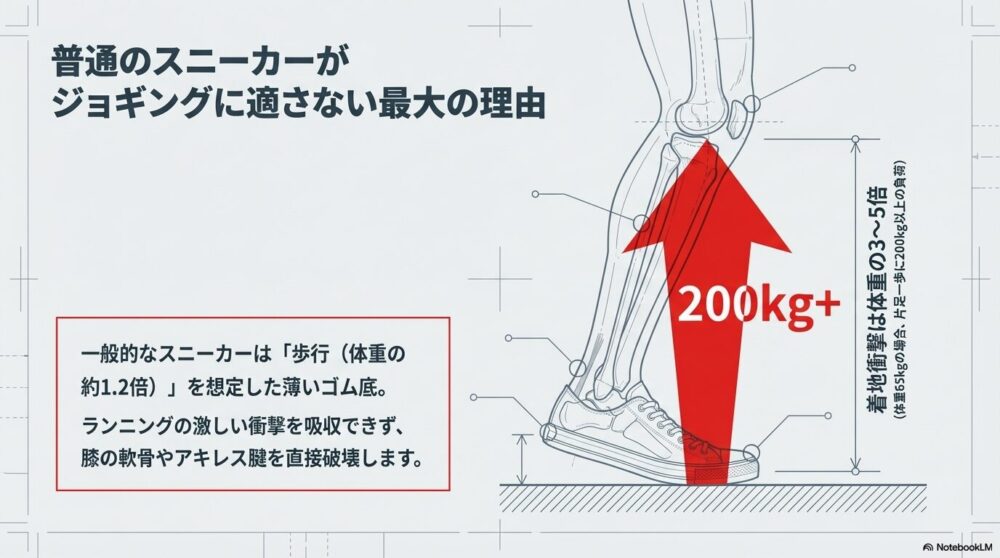 一般的なスニーカーは「歩行(体重の約1.2倍の負荷)」を想定して作られているため、ゴム底が薄く、ランニングの衝撃を吸収しきれません。その結果、衝撃が膝の軟骨やアキレス腱に直接伝わり、膝痛や腰痛を引き起こしてしまいます。