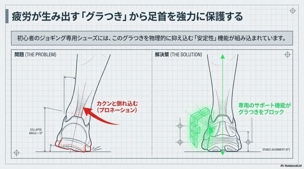 このグラつきをサポートしてくれるのが、「安定性」という機能が備わったジョギングシューズ。足のカカトをしっかり固定してくれる専用シューズ(特にアシックスのGELやミズノのWAVEなど)は、このグラつきを物理的に抑え込んでくれます。