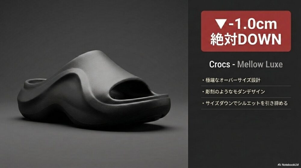Crocsのメロウシリーズは驚異的な柔らかさを提供しますが、設計は極端に大きい。27cmの方が27cm(M9)を買うと、ブカブカで脱げそうになります。つまり、「1cm下げる」のが絶対条件。普段27cmなら迷わずM8(26cm)を選んでください。