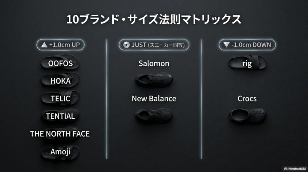 この記事では、人気10ブランド(OOFOS、HOKA、Telic、Salomon、rig、TENTIAL、THE NORTH FACE、New Balance、Crocs、Amoji)のサイズ感を、最新の製品データとリアルな口コミから徹底分析していきます。