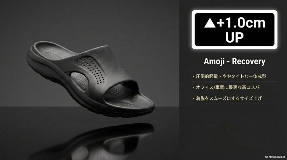 圧倒的な軽量性を誇るAmojiは、特殊樹脂の一体成型でややタイトな設計です。26.5cmの方なら27cmを選ぶなど、「1cmアップ」を選択するのが賢い買い方です。驚くほど軽いため、多少大きくても足が疲れず、着脱もスムーズになります。