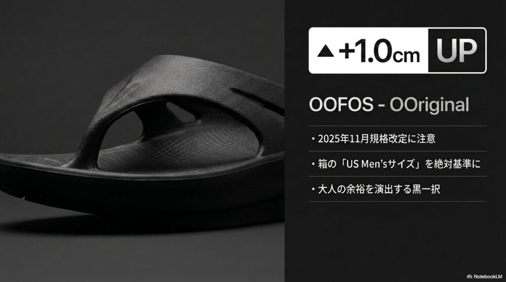 OOFOSで最も注意すべきは2025年11月のサイズ表記改定です。以前の28cmが現在は27cmと表記されており、cm表記を信じると失敗します。