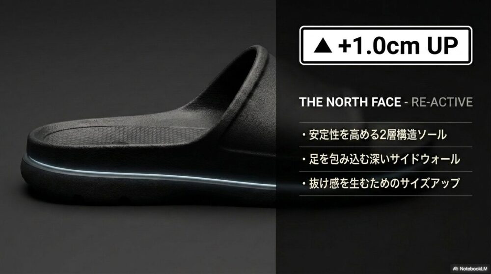 THE NORTH FACEの「リ アクティブ」は、安定性を高める2層構造ソールの影響で柔軟性がやや制限されます。さらに深いサイドウォールで足を包み込む設計なので、ジャストすぎると圧迫感が強くなります。