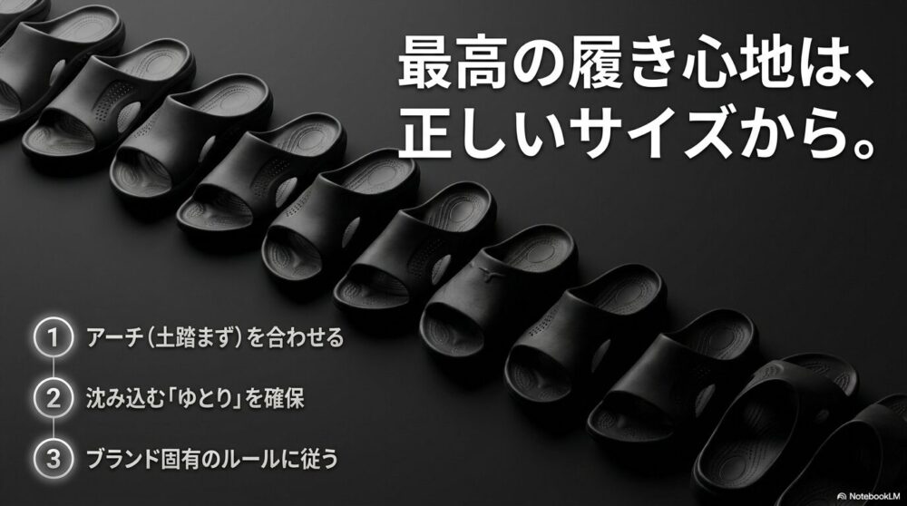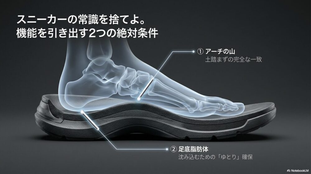 リカバリーサンダル選びを難しくしているのは、スニーカーとは全く異なる「フィッティングの正解」があるからです。ただ「入ればいい」という考えを捨て、まずはその構造的な理由を理解しましょう。