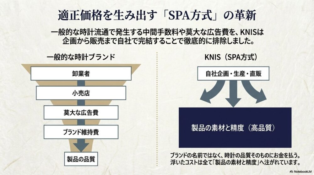 一般的な時計の販売では、メーカーから卸業者、そして小売店へと商品が流れていく中で、多くの中間手数料が発生します。さらに、有名なブランドになればなるほど、莫大な広告費や店舗の維持費が価格に上乗せされてしまいます。KNISは、企画から生産、販売までを自社でまとめて行うことで、こうした余計なコストをすべて省きました。