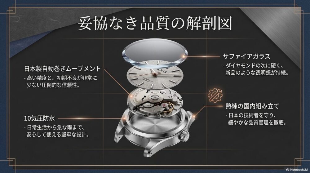 - 徹底した「純日本製」へのこだわり:ムーブメントだけでなく、組み立ても国内で行うことで高い精度と信頼性を実現。