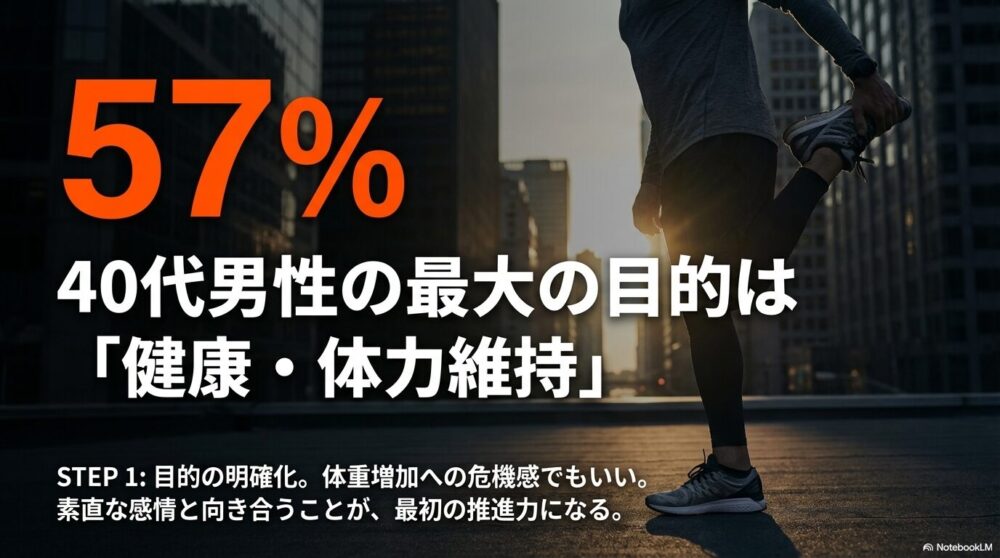 その中でも、男性がランニングをする目的で一番多いのは「健康管理・体力維持」と言われています。また、40代であれば「自己研鑽(自分自身を鍛えること)」という目的の人が多いようです。