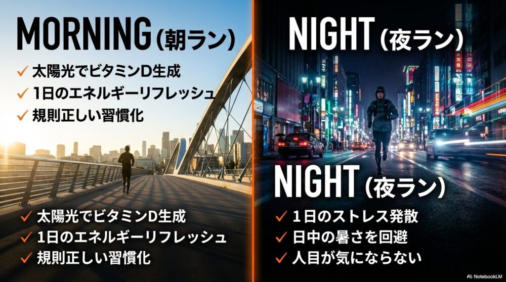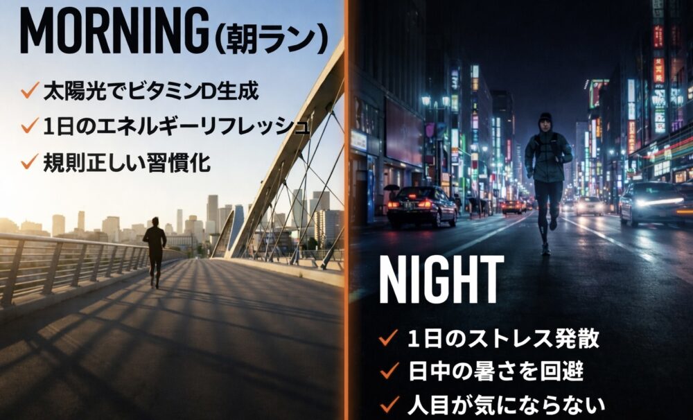 以下に、朝ランニング・夜ランニング、それぞれのメリットと注意点をまとめてみましたので、時間確保の参考にしてみてください。