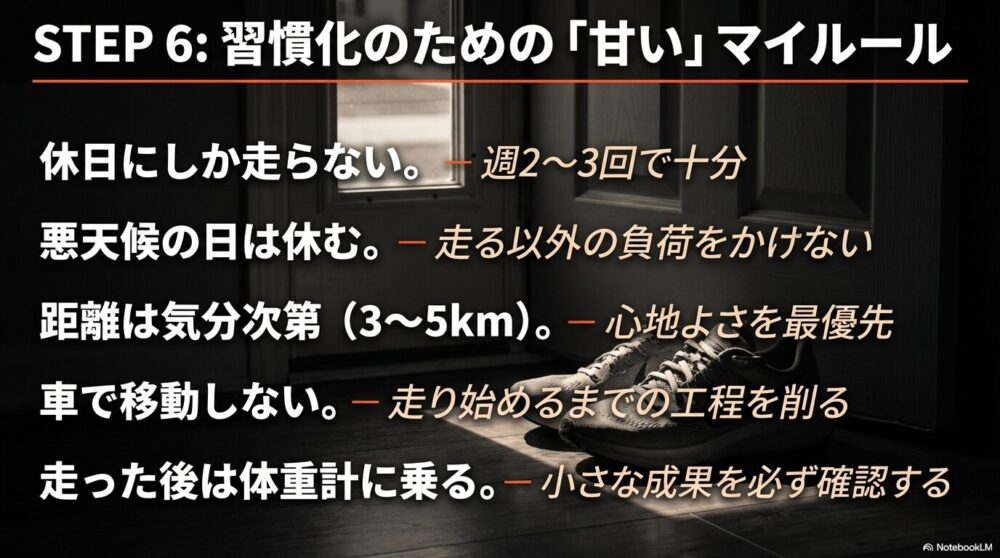 6.ランニングのマイルールを作る:継続させることを優先に、少し甘めのルールを作る